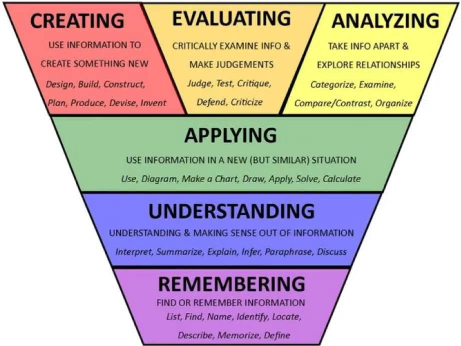 为了满足这一需要,我们不妨使用教育领域的一个古老方法:布鲁姆分类法。这个分类法最早发表于1956年,由教育心理学家本杰明·布鲁姆(Benjamin Bloom)提出,后来在2001年进行了修订。它是一个描述思维水平的层次结构,其中更高的水平代表更复杂的思维。它的六个层次是:
