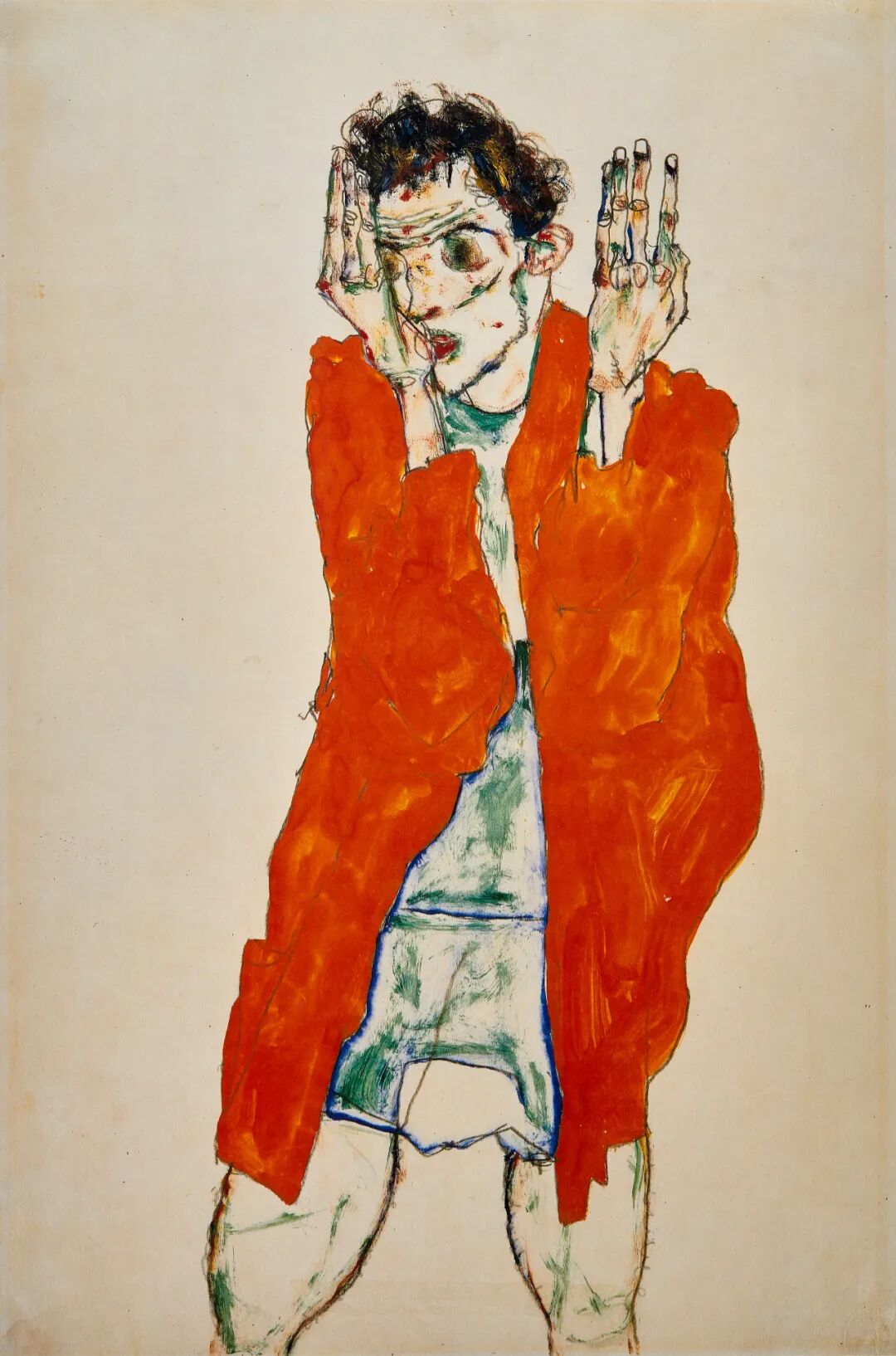 席勒在许多自画像中将自己描绘为一个虽然像人但带有恐怖感的幽灵,姿态常常笨拙,挑战健康人类躯体的正常观感。他的眼睛大胆地凝视着观众,迫使观者仔细观察那扭曲的、皮包骨的身体形态。躯干几乎是透明的,骨骼和器官若隐若现。他的女性人物也以空洞的眼神注视观众,同样迫使观者在短暂的凝视中检查那些苍白、厌食症般的躯体,几乎只是挂在肉体上的枯萎的乳房和乳头。