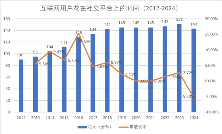 平台遭遇的瓶颈,一是平台自身的扩张触及“天花板”,二是受到他方权力制约的程度加深。在第一个方面,以社交平台为例,数据显示,从2015年到2016年,互联网用户在社交平台上花的时间增长了15.32%,达到了历史最高值,而从2016年到2023年,增长率大幅下降,甚至在2024年出现负增长(-5.3%)。如果说社交平台的商业模式很大程度上依赖于用户的在线时间(只有用户在线才可以不间断地提供数据),那么就可以发现,这一商业模式的红利开始渐渐萎缩。