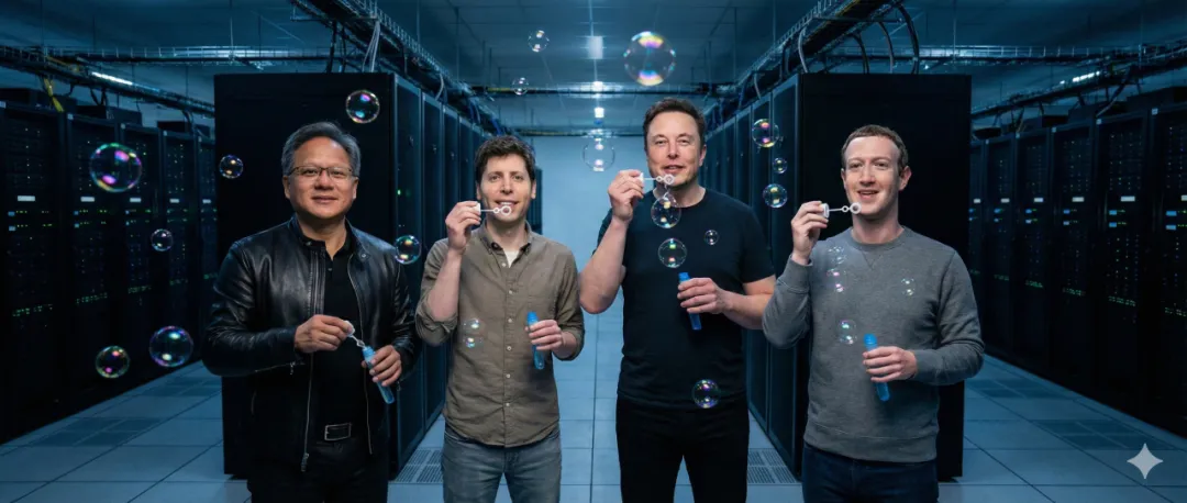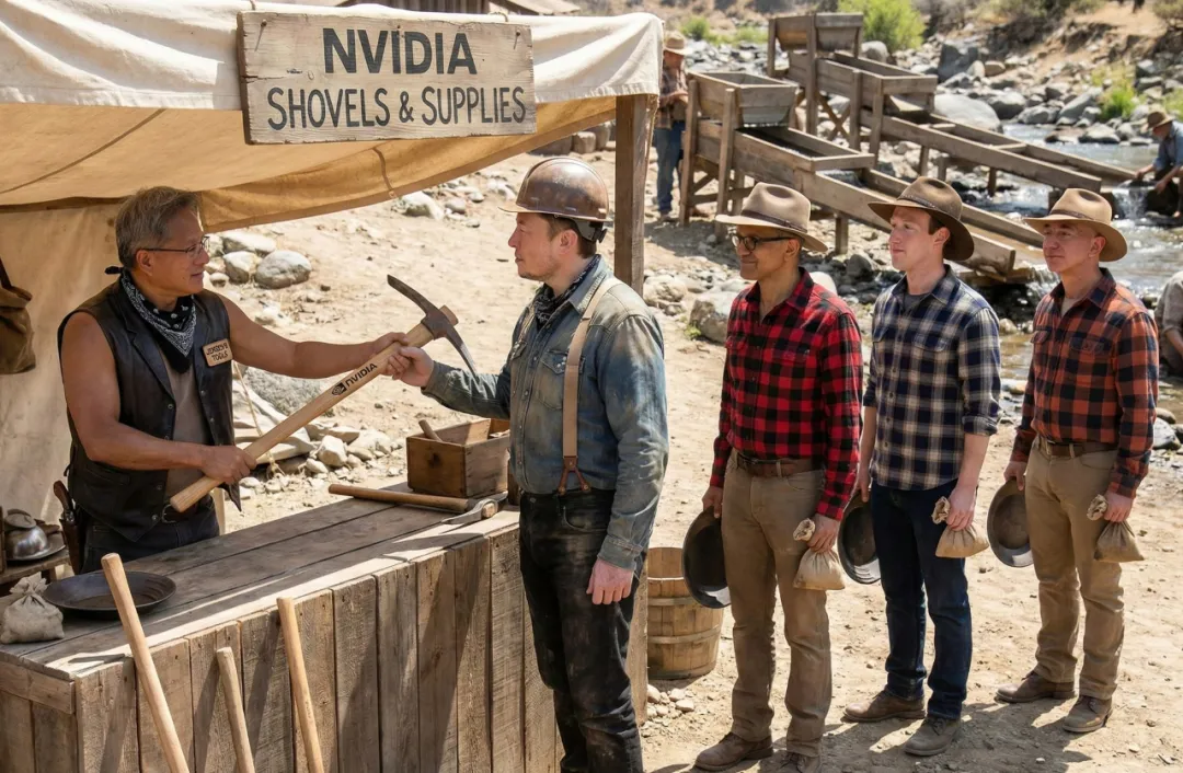 黄仁勋向马斯克、纳德拉等硅谷巨头卖铲子,图片由AI生成
