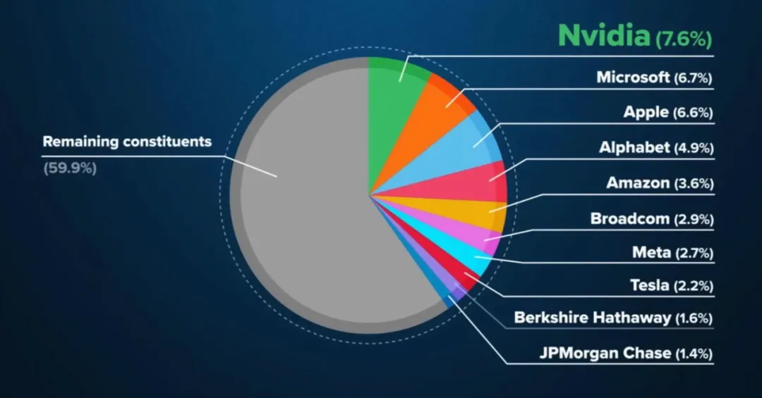 五家公司——英伟达、谷歌、微软、苹果和亚马逊——就占据了标普500总市值的30%。换句话说,投资标普500——一个包含近500家公司、被视为最具代表性的美国经济指标的指数——已经不再提供被动投资者所期望的分散化优势。