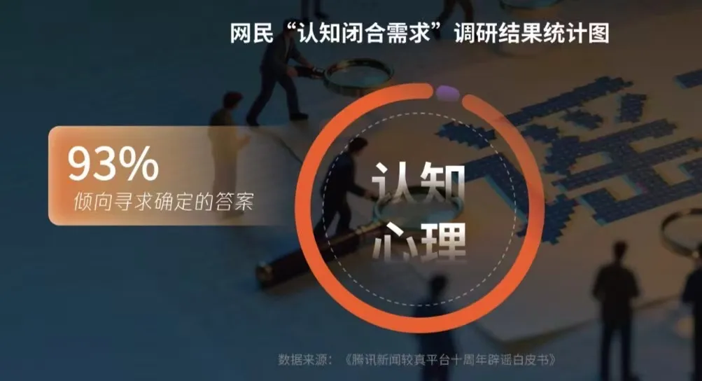 正因如此,大多数人倾向于在信息洪流中寻求捷径。在腾讯新闻较真平台十周年辟谣白皮书里,一项针对1181人的问卷调研结果,有一个触目惊心的发现,有93%的网民非常讨厌“不确定性”,习惯于尽快锁定一个结论,而且一旦认定,就很难被新证据说服。另一个发现则是,只有47%,即不到半数的网民,会在面对真伪难辨的信息时,抱有主动查证的态度。超过一半的人,要么不关心,要么就直接相信了,甚至还会主动传播扩散。
